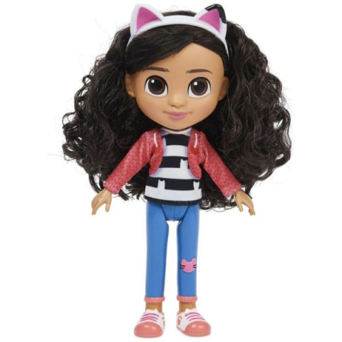 Lógjatok együtt Gabival a NETFLIX népszerű sorozatából a Gabby babaházból!Ez a 20 cm-es baba tetőtől talpig valósághű részleteket tartalmaz, és életre kelti kislányt. Gabi a sorozatból ismert klasszikus ruháját viseli: edzőcipőt, cicás farmert, szövet felsőt és a jellegzetes macskafüleit. Macskafüles fejpántja levehető, és még puha, göndör haja is van, amit formázhattok.Sorozathű megjelenésével tökéletes társ, hogy otthon is eljátszhassátok a saját izg