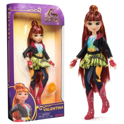 Az Unikornis Akadémia: Valentina divatos baba igazi vagány karakter, aki készen áll a kalandokra! Valentina stílusos megjelenésével és magabiztos kisugárzásával inspirálja a gyerekeket, hogy bátran fejezzék ki önmagukat. Az élénk színekkel és részletgazdag mintákkal ellátott ruházata tökéletesen tükrözi egyedi személyiségét: fekete bőrdzseki, sárga-kockás szok