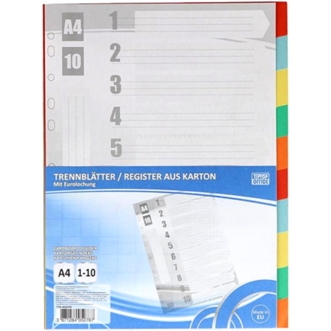 Gyűrűs mappákhoz tökéletes kiegészítés ez a fehér lapokat tartalmazó elválasztó szett, melynek része összesen 10 oldal, színes index-szel, valamint egy tartalomjegyzék oldal. Az A/4-es méretű elválasztó lapok tökéletesen lefűzhetők, hiszen 11-luykas kialakításuknak köszönhetően éppen ott illeszkednek a mappába ahol kell. A színes elválasztólapokkal jól elkül