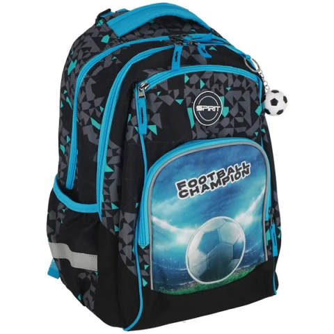 A Spirit Football Champion iskolatáska minden focirajongó kisdiák számára igazi telitalálat! A látványos, stadionos háttérrel és labdával díszített dizájn már első pillantásra elárulja, hogy egy igazi bajnokhoz illő hátizsákról van szó. A fekete, kék és szürke geometrikus mintázat vagány és lendületes megjelenést kölc