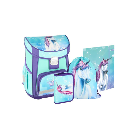 Fedezd fel a varázslatos világot a Spirit Little Dream iskolatáska szettjével! Ez a 4 az 1-ben csomag egy kék és lila alapon pompázó mágikus unikornis mintával teszi még vidámabbá az iskolakezdést. A csomag tartalmaz egy ergonomikus, merevfalú iskolatáskát, egy A/4-es méretű gumis mappát, egy kihajtható tolltartót és egy tornazsákot.