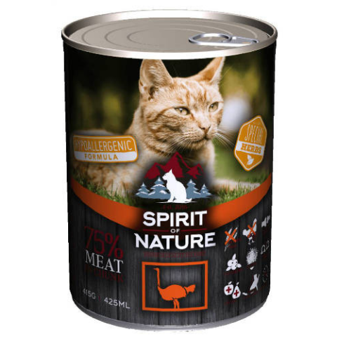 A Spirit of Nature teljes értékű hipoallergén eledel felnőtt macskák számára, strucchússal készült. Nem tartalmaz baromfit és gabonát, 75%-os hústartalmával és válogatott gyümölcsökkel, gyógynövényekkel, omega zsírsavakkal, glükozaminnal és kondroitinnel