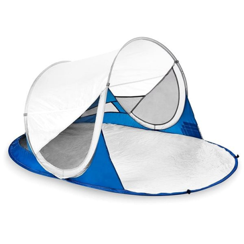 Strandsátor - másodperces sátor, alagút, 2 személyes, egy bejáratos, üvegszál szerkezet, egy rétegű ponyvával, tömege: 0,9 kg, mérete szétrakott állapotban: 100 × 195 × 85 cm (ma × sz × mé), mérete összecsukva 63 × 63 × 5 cm (ma × sz × mé) The Spokey Stratus beach tent in white with blue details will provide you with comfortable shade while relaxing by the sea and protect you from wind gusts. It has UV protection at UV 40 level and mesh