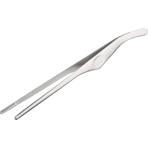 Ezüst színű Spring Profi konyhai csipesz, 30 cm hosszú, ideális az ételek tálalásához és díszítéséhez. Lehetővé teszi az élelmiszerek pontos megfogását és kezelését. Márka: Spring.
