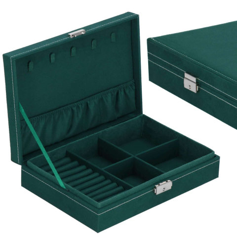 Elegáns Zöld Ékszerdoboz: Tökéletes Ékszereid Rendszerezésére és Védelmére 💎 Ez a gyönyörű, sötétzöld velúr ékszerdoboz ideális megoldás minden ékszerkedvelő számára. Több rekeszének és kampójának köszönhetően könnyedén rendszerezheted nyakláncaid,...