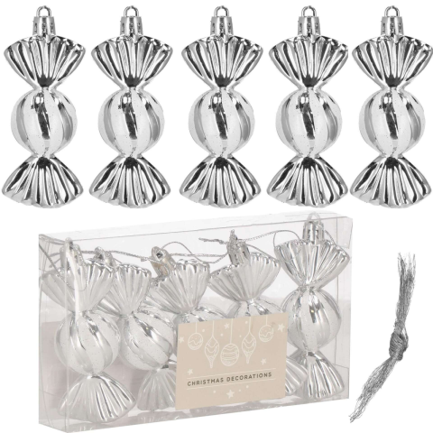 Springos Karácsonyfadísz - Ezüst Cukorka - 5 db Elegáns és ünnepi hangulatot varázsol otthonába ez az 5 darabos, ezüst színű karácsonyfadísz-szett. Minden dísz egy-egy csillogó cukorkát formáz, melyek tökéletes kiegészítői lesznek karácsonyfájának....
