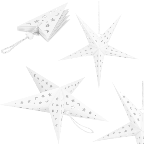 Csillag alakú papír lámpa: Karácsonyi dekoráció, 25 cm Ez a gyönyörű, 25 cm magas fehér papírlámpa tökéletes karácsonyi dekoráció a lakásodba! ✨ Kivágott csillag és hold mintával díszített, elegáns és ünnepi hangulatot teremt. Könnyen össze- és szé...
