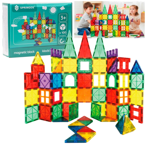 Alapvető adatok: Márka: Springos® Anyag: műanyag, mágnes Szín: többszínű (átlátszó elemek sárga, kék, piros, zöld, lila színben) Elemek száma: 100 Gyermekeknek szánt termék: 3+ Tanúsítvány: CE 100% BPA-MENTES A nem mágneses elemek összeillesztése pat...