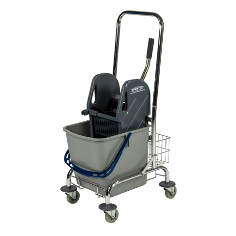 Vödör térfogata 27 liter. Krómozott fém váz integrált tárolókosárral és tolófogantyúval. Tartós műanyag vödör és robusztus, dupla hátú felmosóprés. Méret: (H x Sz x M) 50 x 41 x 98 cm. Cikkszám: 301035