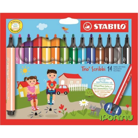 STABILO Filctoll készlet, 1,5-2 mm, rugós hegy, STABILO "Trio Scribbi", 14 különböző szín filctoll, marker termékleírás