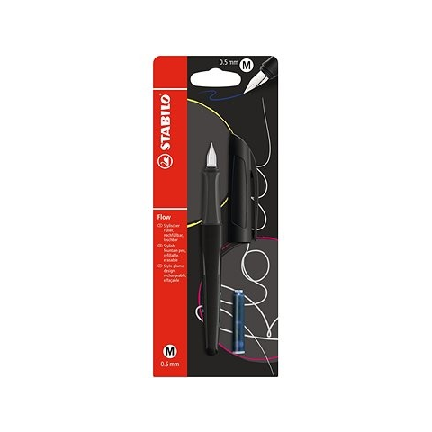 Töltőtoll - folyékony tinta, kék színű, cserélhető töltet, 1 darab a csomagban, anyaga műanyag, vonalvastagság 0,5 mm, felpattintható kupakkal Írd az összes feljegyzésedet, ötletedet vagy tervedet STABILO Flow töltőtollal, amely azonnal egyedi stílust sugároz. Ez az írószer nemcsak dizájnjával, de minőségével is megnyer. Az ergonómiailag kif