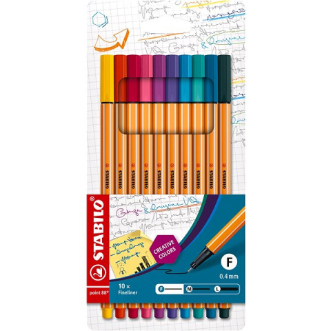 Tűfilc készlet - 0,4 mm vonalvastagsággal, kerek alakú, tinta szín(ek), lemosható, hatszögletű markolat, 10 tűfilc a csomagban A kiváló minőségű STABILO point 88 10 db tok, különleges színek termék leglényegesebb előnyei A pompás STABILO tűfilc készlet nélkülözhetetlen az íráshoz vagy a művészeti tevékenységhez Ideális különb
