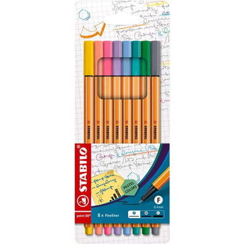 Tűfilc készlet - 0,4 mm vonalvastagsággal, kerek alakú, tinta szín(ek), hatszögletű markolat, 8 tűfilc a csomagban A minőségi STABILO point 88 8 db tok "Pasztell" termék legfontosabb tulajdonságai A minőségi STABILO tűfilc készlet elengedhetetlen az íráshoz és a rajzoláshoz Remek megoldás alkotáshoz és íráshoz egy