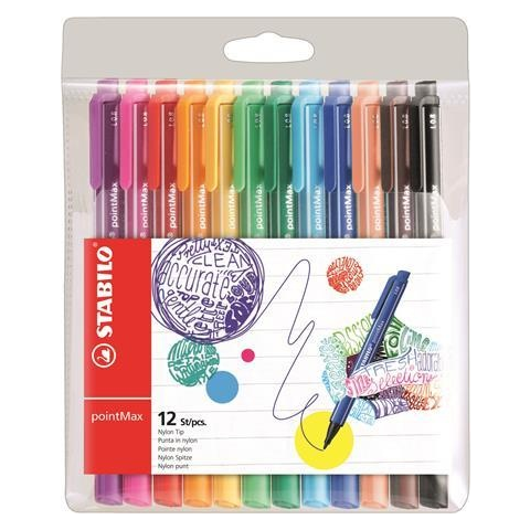 Rostirón készlet, 0,8 mm, STABILO Point Max, 12 különböző szín (TST48812) 0,8 mm hegyátmérőjű színes rostirón elsősorban íráshoz intenzív színek szagtalan, vízbázisú tinta 24 órán át nem szárad ki kupak nélkül Gyártó/első EU forgalmazó elérhetősége: