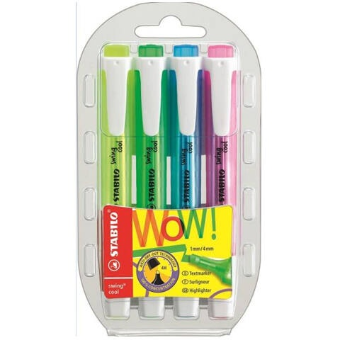 Ebben a csomagban kapásból négy élénk színű Swing Cool szövegkiemelő is helyet kapott. A Swing Cool szövegkiemelő filcek lapos, de keskeny kialakítása kényelmes fogást eredményez, és még a tolltartókban is kényelmesen elfér. A védőkupak alatt lévő vágott