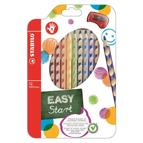 Színes ceruza készlet, háromszögletű, jobbkezes, STABILO EasyColours, 12 különböző szín - ergonomikus, háromszögletű, vastag test - ceruzavégen sárga és piros festés a jobb- és balkezes változat megkülönböztetésére - szennyeződést gátló lakk a fogózó