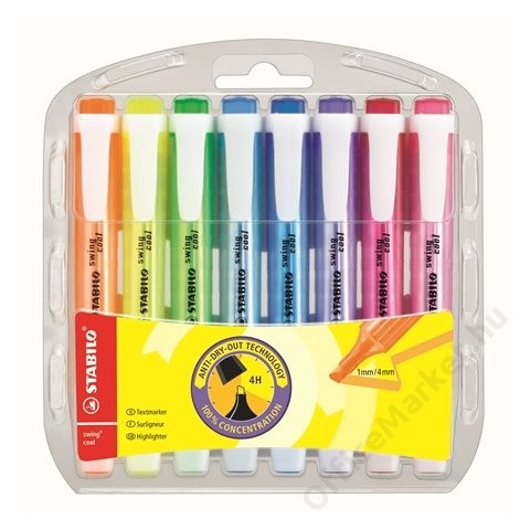Szövegkiemelő készlet, 1-4 mm, STABILO Swing Cool, 8 különböző szín (TST27583) - STABILO Anti-Dry-Out technológia: 4 órán át nem szárad ki kupak nélkül, a koncentrált munkáért - tökéletesen használható útközben, praktikus klippel - fényes, csíkozott to