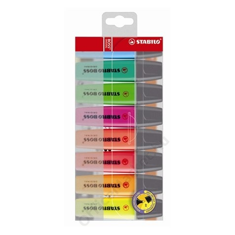 Szövegkiemelő készlet, 2-5 mm, STABILO BOSS original, 8 különböző szín (TST708) '- egyedi, klasszikus dizájn - vágott hegy - élénk színek - a tinta színével megegyező tolltest - hosszú nyitva tarthatósági idő: 4 órán át nem szárad ki kupak nélkük,