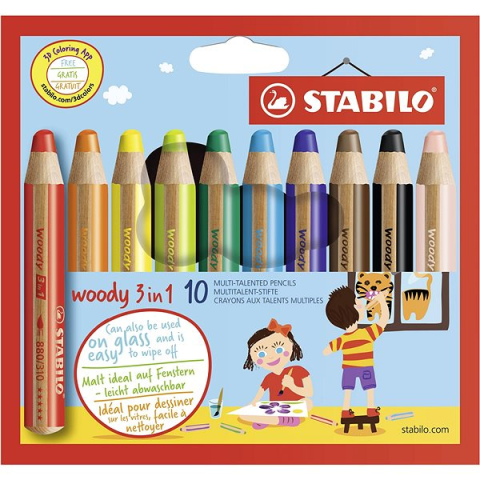 Színes ceruza STABILO - lemosható, kerek, jobb- és balkezes, vastag markolat, papír, üveg, fém és fa felületekre, hagyományos színek, puha ceruzabél 10 mm átmérővel, PEFC tanúsítvány, papír csomagolás, 10 ceruza a csomagban A Stabilo Woody 3 az 1-ben készlet 10 színes ceruzát tartalmaz, melyek vastag kialakításuknak köszönhetően már 3 éves gyerekek számára is alkalmasak. A készlet 6 alapszínt tartalmaz, melyek színt