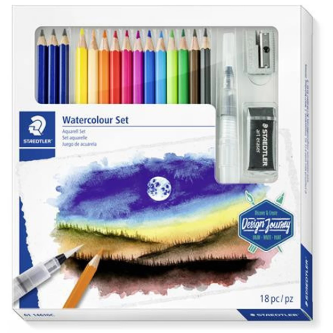 1 kép STAEDTLER Akvarell ceruza készlet ecsettel radírral hegyezővel grafitceruzával Design Journey 12 különböző szín