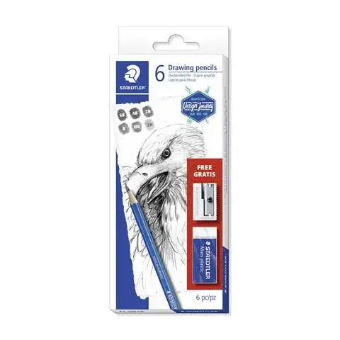 -a készlet 6 különböző keménységű ceruzát (2H, HB, B, 2B, 4B, 6B), egy hegyezőt és egy radírt tartalmaz