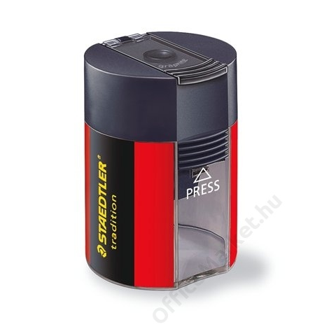 Hegyező, egylyukú, tartályos, STAEDTLER 511, fekete-piros (TS511005) - sztenderd méretű grafitceruzák számára 8,2 mm átmérőig, 23°-os hegyezési szög a tiszta és pontos vonalakért - oldalán található gombbal nyitható, ezáltal nem engedi kihullani a forg