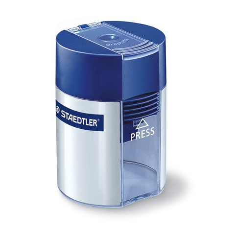 Hegyező, egylyukú, tartályos, STAEDTLER 511, kék -sztenderd méretű grafitceruzák számára 8, 2 mm átmérőig, 23°-os hegyezési szög a tiszta és pontos vonalakért -oldalán található gombbal nyitható, ezáltal nem engedi kihullani a forgácsot -fedéllel ell