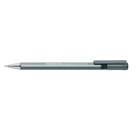 Nyomósirón, 0,5 mm, STAEDTLER Triplus Micro 774, szürke - ergonomikus háromszög forma a kényelmes és könnyű írásért - krómozott fémhegy - nyomógombos mechanika - visszasüllyeszthető grafitbél-kivezető védi a hegyet a töréstől - extra hosszú PVC és