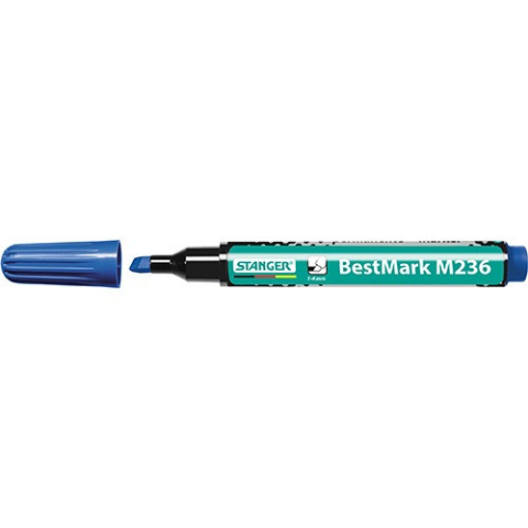 Marker Stanger M236 permanent vágott kék Típus: M236 Hegy: vágott Írásvastagság: 1–4 mm Írásszín: kék permanent festékkel töltött marker alkoholbázisú műanyag, fém-, üveg- és fafelületekre