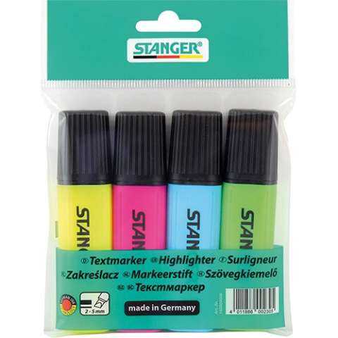 Szövegkiemelő Stanger 4 db-os klt. Írásvastagság: 1–5 mm Írásszín: 4 db-os készlet intenzív színű, toxinmentes tintával töltött szövegkiemelő nem kenődik el DIN szabványnak megfelelő tinta UV stabilizátorral másolható és faxolható