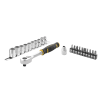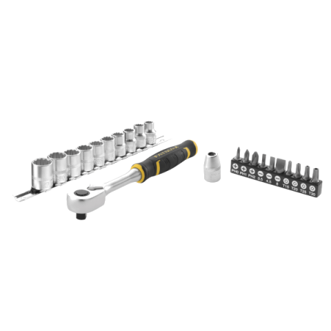 Tartalma: 22 db 3/8 ": 1 hajtókar 120 foggal, 10 db dugókulcs (8-9-10-11-12-13-14-15-16-17 mm), 1 db bit adapter 3/8", 10 db bithegy (Ph.0-1-2, 3,5-4,5-8 - TT15-TT20-TT25-TT30)