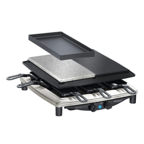 Tapadásmentes öntött grill lap és természetes kő grill lap 8 darab zománcozott serpenyő Zsír és folyadék felfogó perem Állítható hőmérséklet Működési jelzőlámpa Vezeték tároló Krómozott díszburkolat