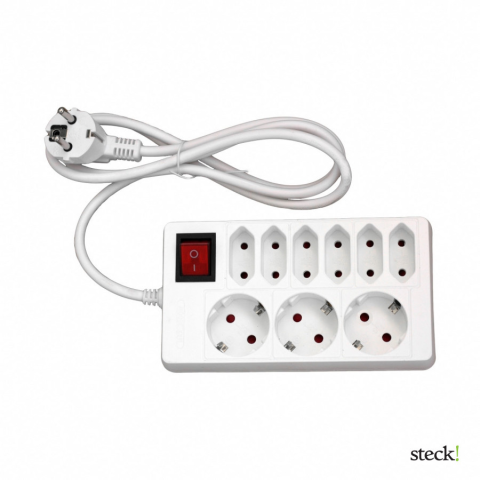 fehér világító kapcsolóval 3 db földelt - 6 db eur védőérintkezős aljzattal kábel hosszúság: 1,4m 250V~; max. 16A/2,5A; 3680W H05VV-F 3x1,0mm² x 1,4m gyártó: steck!