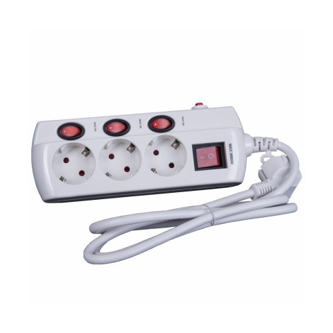 3 db védőérintkezős aljzattal 1,5 m hosszú, H05VVF 3G1,5 mm2 keresztmetszetű, fehér kábellel egy világító főkapcsolóval és külön aljzatkapcsolókkal túláramvédelemmel ellátott 250 V/ max. 16 A/ 3680W
