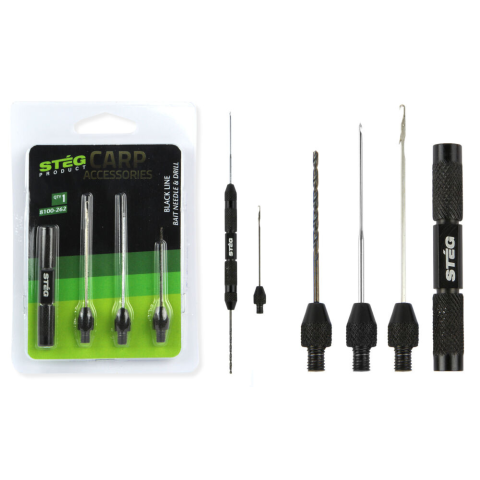 A fémből készült nyélhez csavarozható csalifúró (4 cm), kemény magok, bojlik lyukasztásához, kapcsos fűzőtű (5,5 cm) a puha, vagy előfúrt csalikhoz, szerelékekhez. Vagy kapocs nélküli fűzőtű (5 cm), amellyel bojlikat, pelleteket, főtt magokat fűzhetünk fel a hajszálelőkére.