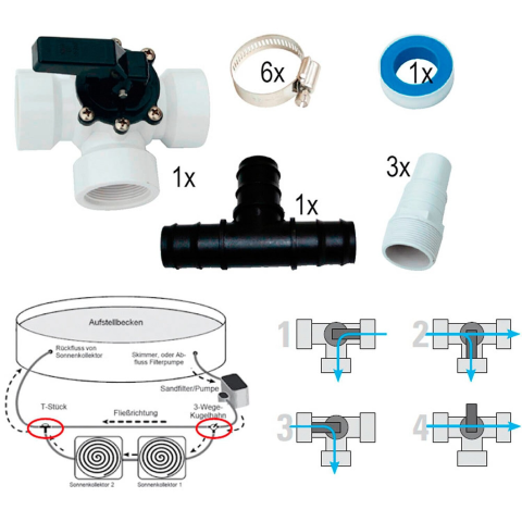 A készlet egy 3 utas szelepből, T-idomból, tömlővégből, tömlőbilincsből és teflonszalagból áll. Ideális az átfolyó víz mennyiségének szabályozásához, speciálisan szolárberendezésekhez és hőszivattyúkhoz, kifejezetten 38 cm-es tömlőcsatlakozáshoz.