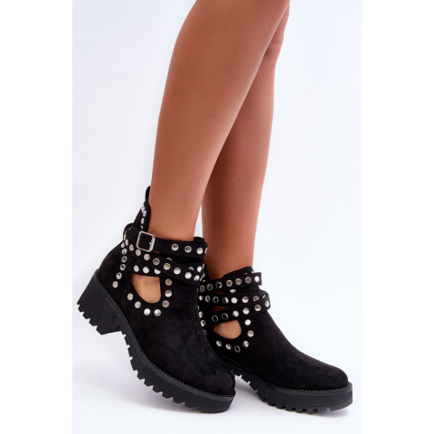 Női Bokacsízma Step In Style MM-184024. Színe: FeketeA klasszikus női csizma öko-szarvasbőrből készült. Ezenkívül a csizmát szegecsekkel díszítették. Ezek a csizmák felsliccelhetőek, és csattal rögzített pánttal rendelkeznek. Divatos kivágások az oldalán jellemzik ezt a modellt. A csizma lapos sarkon és platformon áll. anyag ~skóra ekologiczna zamszowa Talpbetét műbőr Szár magassága 12.5 cm Sarokmagasság 5.5 cm Talp magass