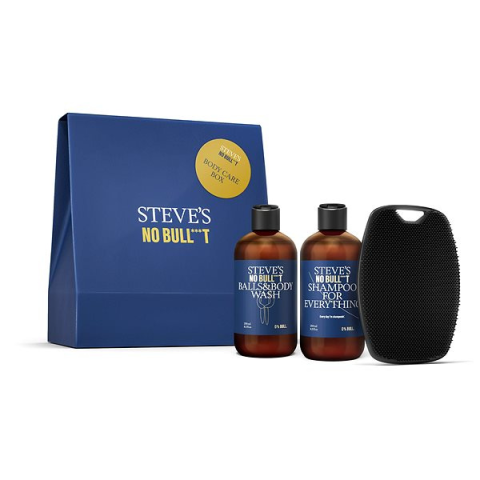 Férfi kozmetikai szett - tartalmaz: Shampoo 250 ml, Balls&Body Wash 250 ml, The Fancy body brush A zuhanyzó a férfiak szentélye, ahol a STEVE'S Steve's Box teljes testápoló készletével tisztíthatja meg egész testét. A csomag tartalmaz haj- és szakállsampont, tusfürdőt és szilikonkefét. STEVE'S St