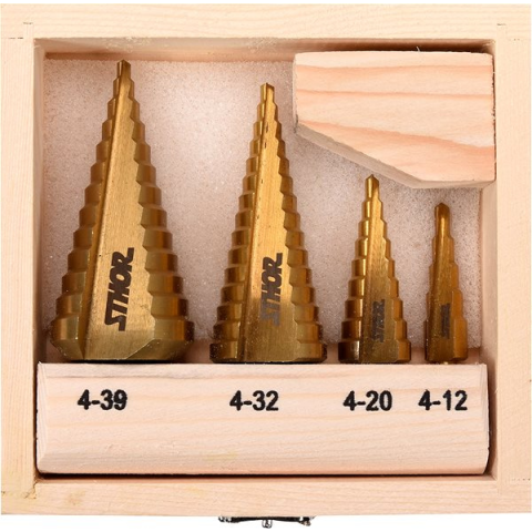 Fúrószár készlet - fém, lépcsős, hengerszár befogatás, 4 darabos csomag A Sthor készlet 4 db lépcsős fúrószárat tartalmaz, amelyet fémek fúrásához fejlesztettek ki. Lehetővé teszik, hogy fokozatosan, **többféle átmérőjű lyukakat fúrj.** A fúrószárak HSS acélból készültek,