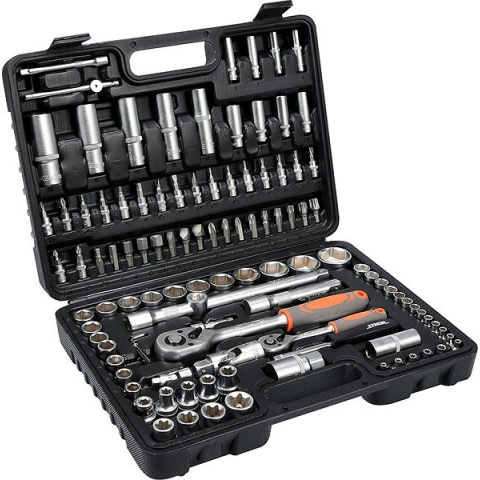 Krova készlet - bitek, átalakító, hosszabbítás, csúszó szár, feltét és egyéb kéziszerszámok a csomagban, Lapos (SL), Phillips keresztfejű (PH), Pozidriv keresztfejű (PZ), Imbusz (HEX) és Torx (T) bitek, koffer a termék része, 108 darabos készlet, 1/4" és 1/2" négyszögletű méret, műanyag fogantyú, 45 fog, As-Drive rendszerrel, tok mérete 9 × 37 × 28 cm (Ma×Sz×Mé) Profi készlet STHOR TO-58688 tartalmaz sok különböző bitek, villáskulcs, adapterek és egyéb ki