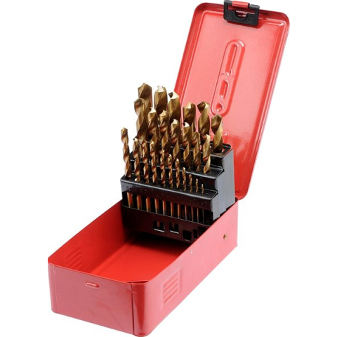 Fúrószár készlet - fém, kúp, hengerszár befogatás, 24 darabos csomag Ez a praktikus, edzett felületű gyorsacél fémfúrószár készlet kiválóan alkalmas rozsdamentes és saválló acél fúrásához. A titán-nitrid bevonatnak és a 135°-os vágási szögnek köszönhetően hatékonyan el