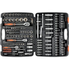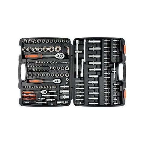 Krova készlet - bitek, hosszabbítás, csúszó szár és feltét a csomagban, Lapos (SL), Phillips keresztfejű (PH), Pozidriv keresztfejű (PZ) és Torx (T) bitek, koffer a termék része, 173 darabos készlet, 1/4", 1/2" és 3/8" négyszögletű méret, műanyag fogantyú, 45 fog, As-Drive rendszerrel, tok mérete 11 × 38 × 35 cm (Ma×Sz×Mé), tömege 9 kg Profi készlet STHOR TO-58688 tartalmaz sok különböző bitek, villáskulcs, adapterek és egyéb kiegészítők, amelyek kielégít