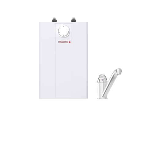 5 l térfogatú kisméretű melegvíz-tároló, egy közepes melegvíz igényű vételezési hely ellátását biztosítja. Ennek köszönhetően akár 10 liter 40 °C-os hőmérsékletű víz is vételezhető. Praktikus készlet egykaros csapteleppel, fokozatmentes hőmérséklet-választás kb. 35 és 85 °C között, esetleges hőmérséklet-korlátozással. Pult alatti szerelés, gyorsan és gond nélkül felszerelhető mosdó alatt. A hálózati csatlakozódugó kihúzásával visszaállít