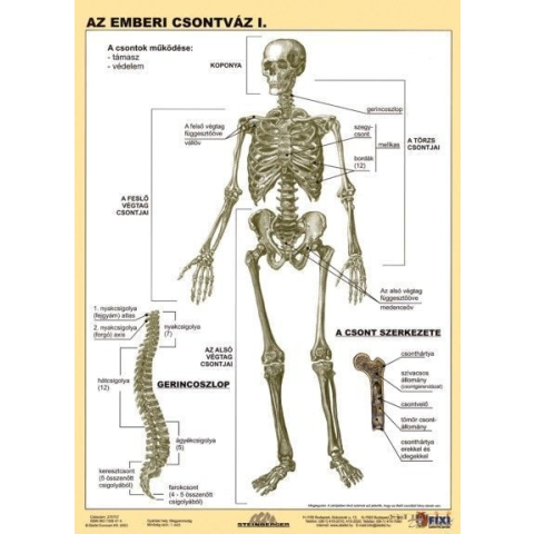 Oktatótabló, fóliázott-lécezett kivitelben. Válasszon a tanulói munkalapból is az oktatótabló mellé, kedvezőbb áron! Az emberi csontvázat bemutató tablópárosunk első része a csontváz részeivel, a gerincoszloppal és a csont szerkezetével ismerteti m...