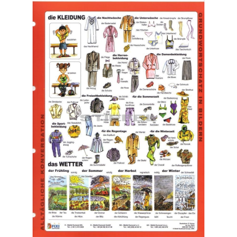 Oktatótabló, fóliázott-lécezett kivitelben. Válasszon a tanulói munkalapból is az oktatótabló mellé, kedvezőbb áron! Az öltözködéssel és az időjárással kapcsolatos német kifejezések összefoglalása, a nyelvtanulás megkönnyítésére. A fehérneműktől az...