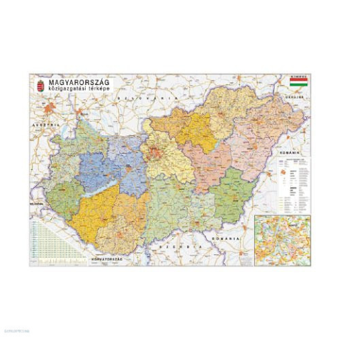 A térkép tartalma: Minden magyarországi település és fontosabb településrész, naprakész úthálózat és a tervezett autópályák (M8, M9…stb), vasúthálózat, kikötők, repülőterek, ipari parkok, közigazgatás (megyei bontás, régiós színezéssel), járások határai