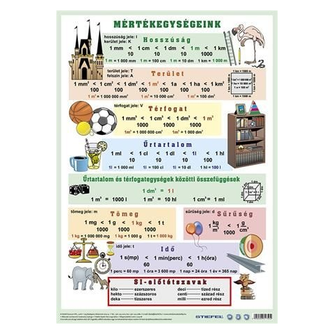 A mértékegységek áttekintése szemléletes rajzokkal, amelyek segítenek a tanultak rögzülésében. Hátoldalán gyakorló oldallal