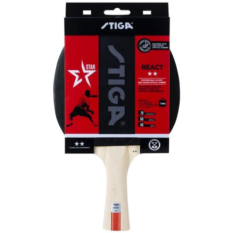 Pingpongütő - kétcsillagos, konkáv (FL) fogantyú, tömege 180 g A Stiga React pingpongütő kifejezetten a szabadidős és haladó játékosok számára készült. Nagyobb sebességnél nagyobb irányíthatóságot biztosít. Homorú fogantyúval és minőségi bevonattal van ellát