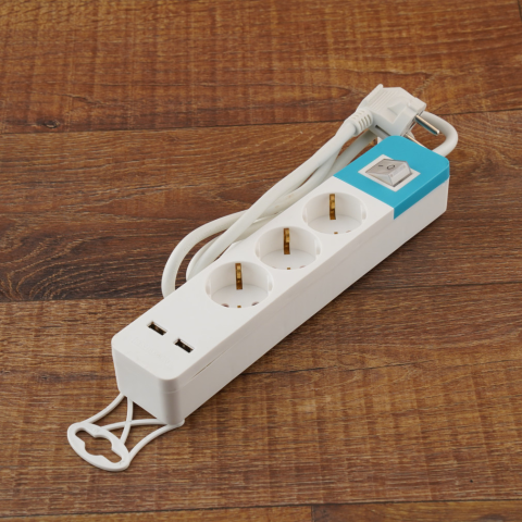 Hálózati elosztó 3db aljzat 1,5fm vezetékkel, kapcsolóval (H05VV-F 3x1,5 mm2) +2db USB port (2,1A 5V) kék-fehér Stilo STI1627