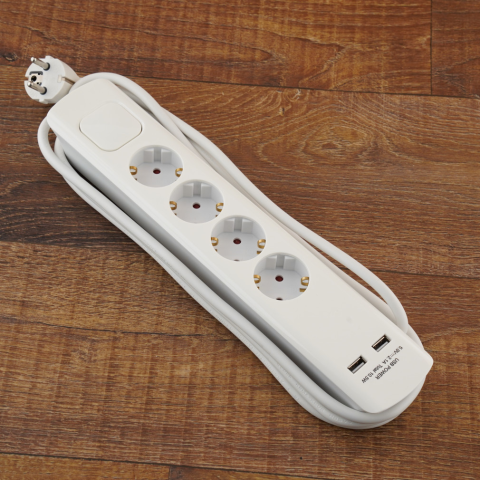 Hálózati elosztó 4db aljzat 3fm vezetékkel, kapcsolóval,(H05VV-F 3x1,5 mm2) fehér +2db USB port (2,1A 5V) Stilo STI1670